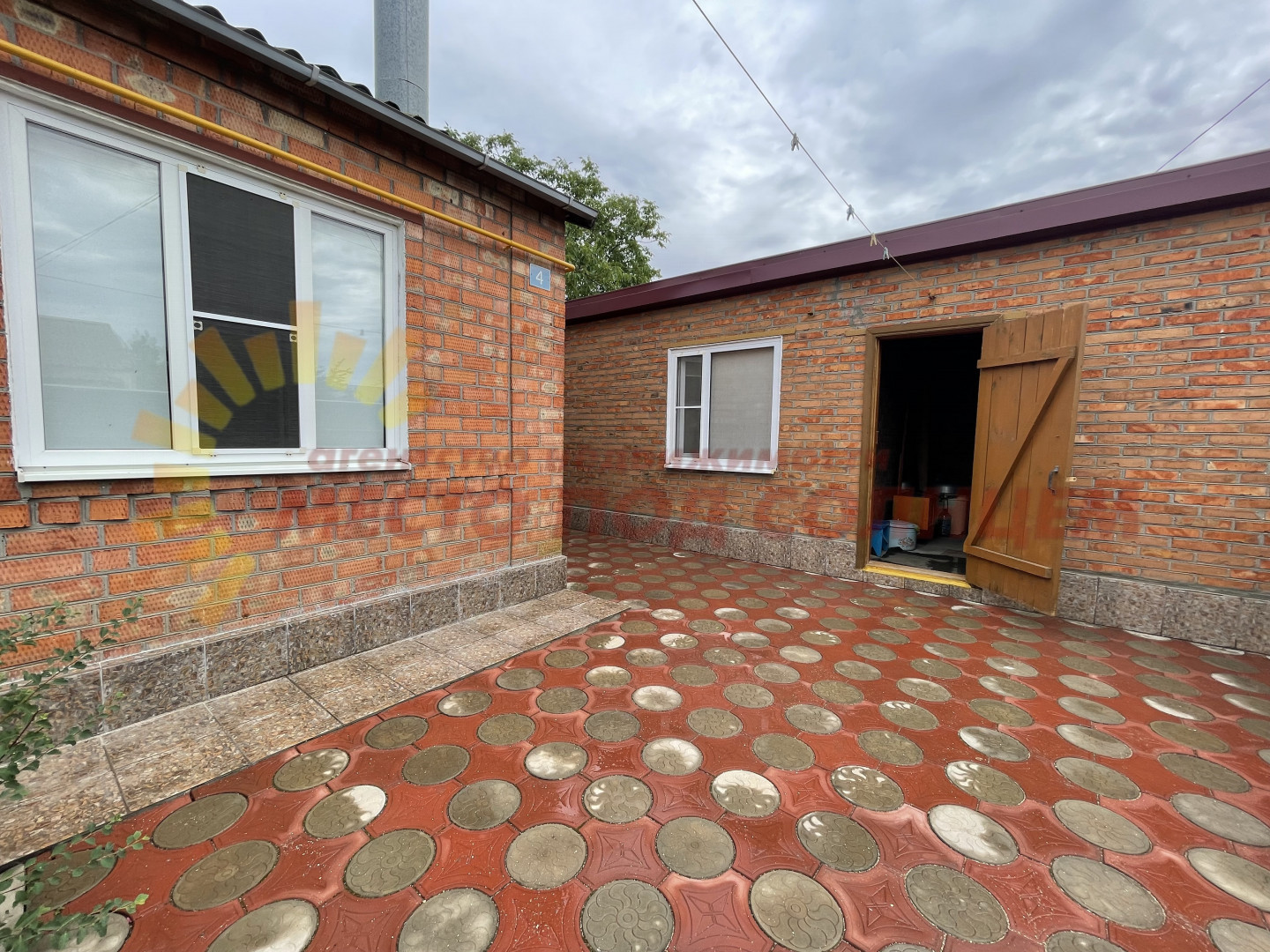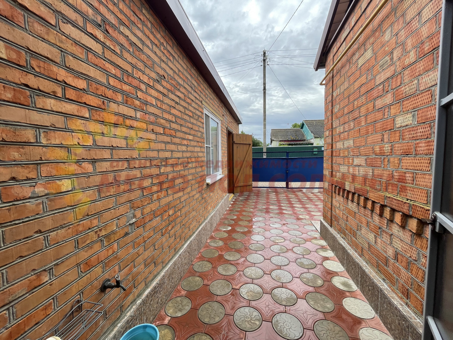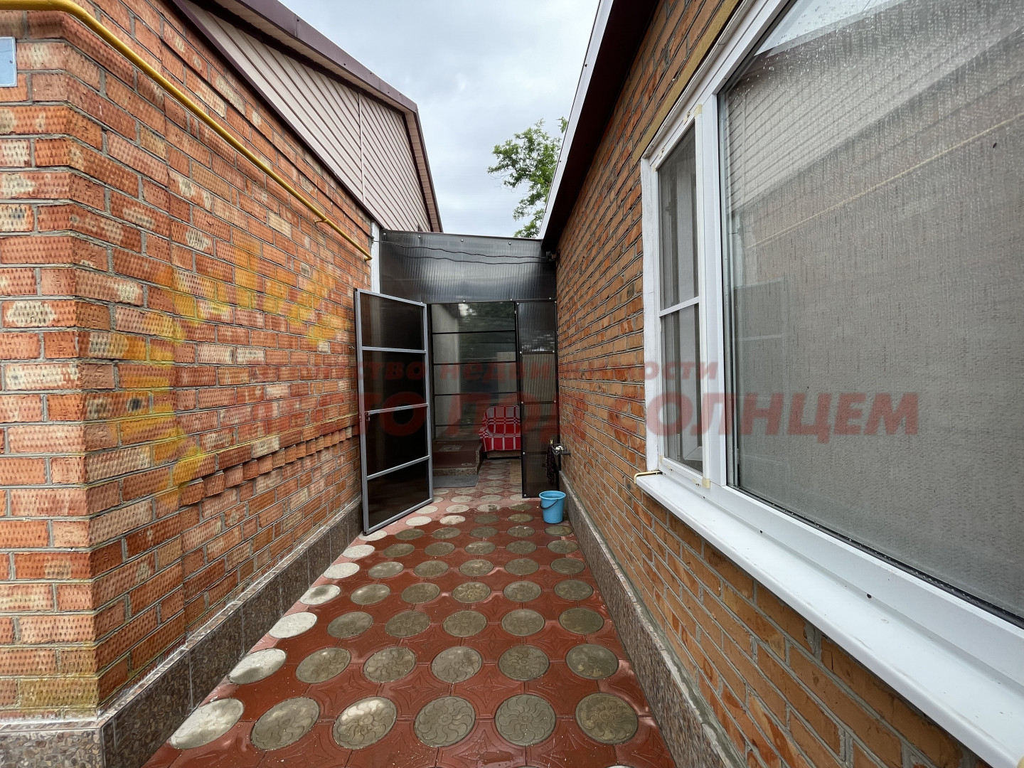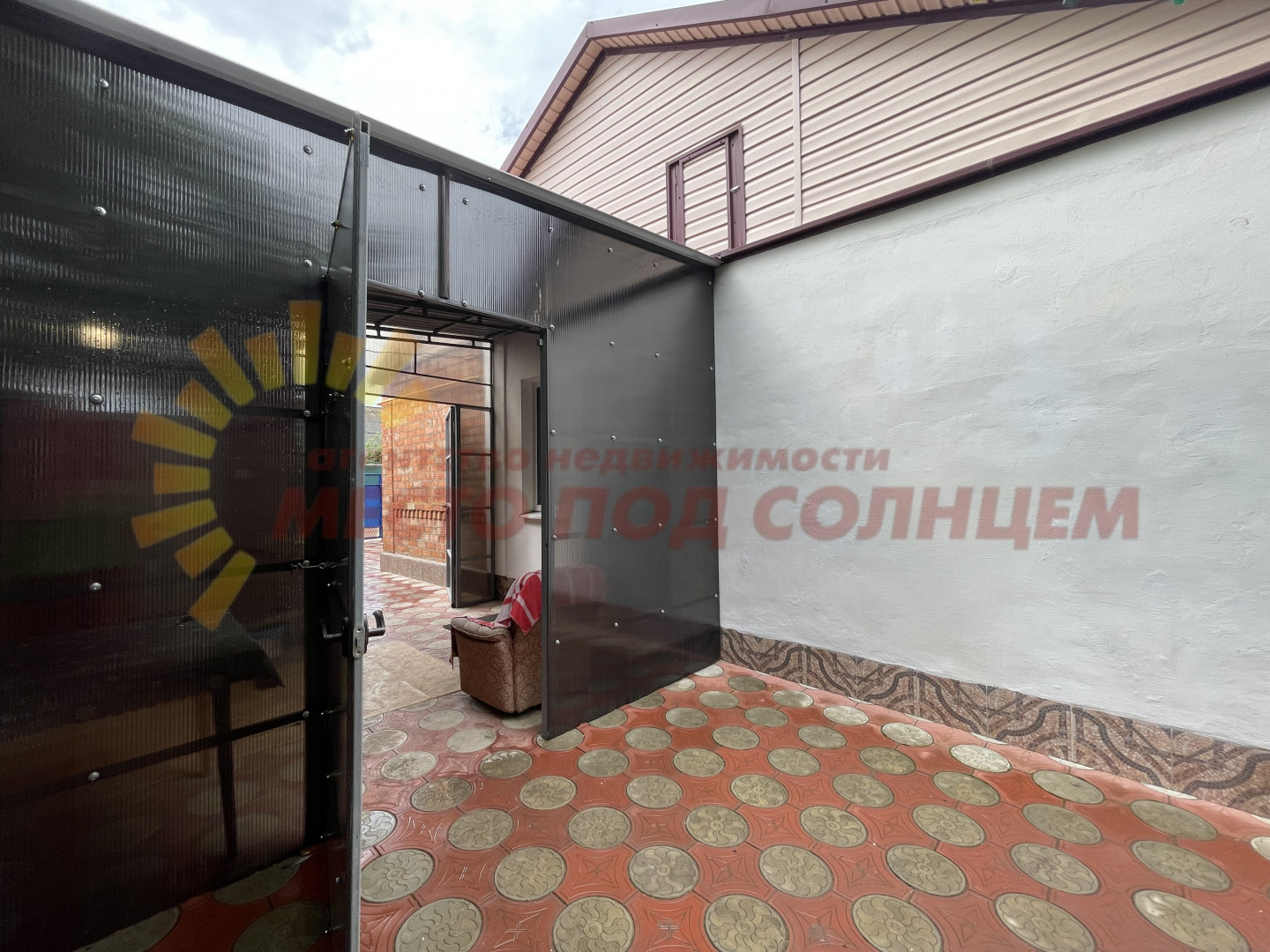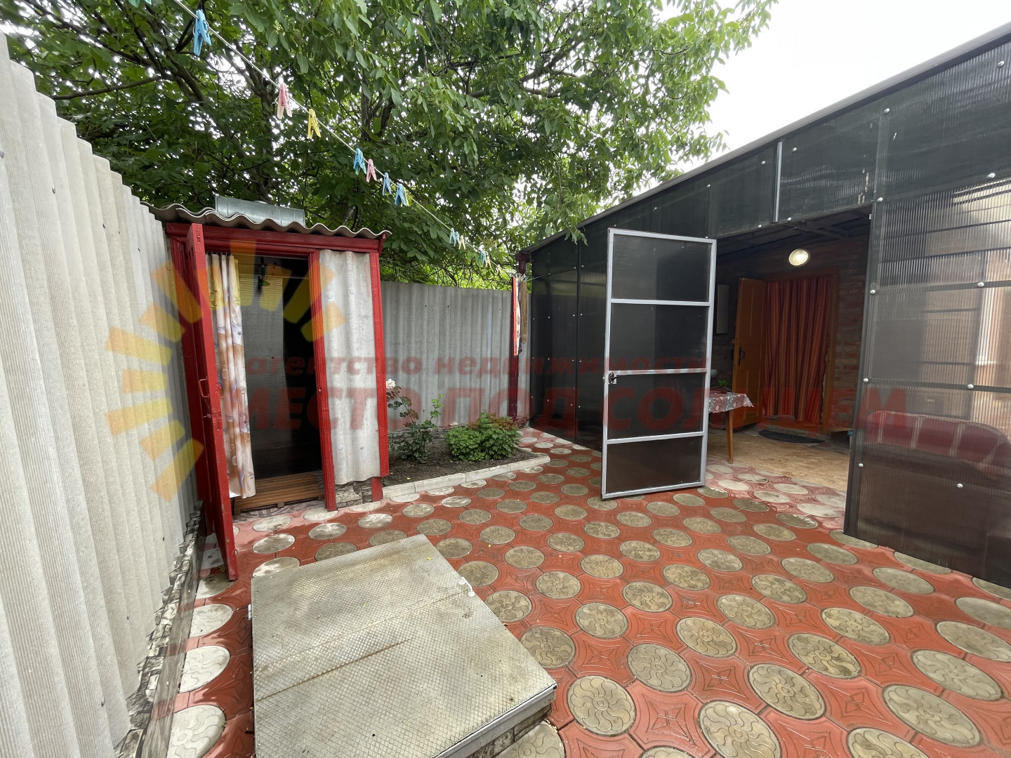 Участок имеет два въезда для машины с двух сторон. Двор выложен плиткой и ухожен. Вход в дом оборудован беседкой с навесом из поликарбоната, что обеспечивает тень и комфортное место для отдыха. На территории также имеется летняя кухня с водой и электричеством, которую можно использовать для дополнительного заработка.