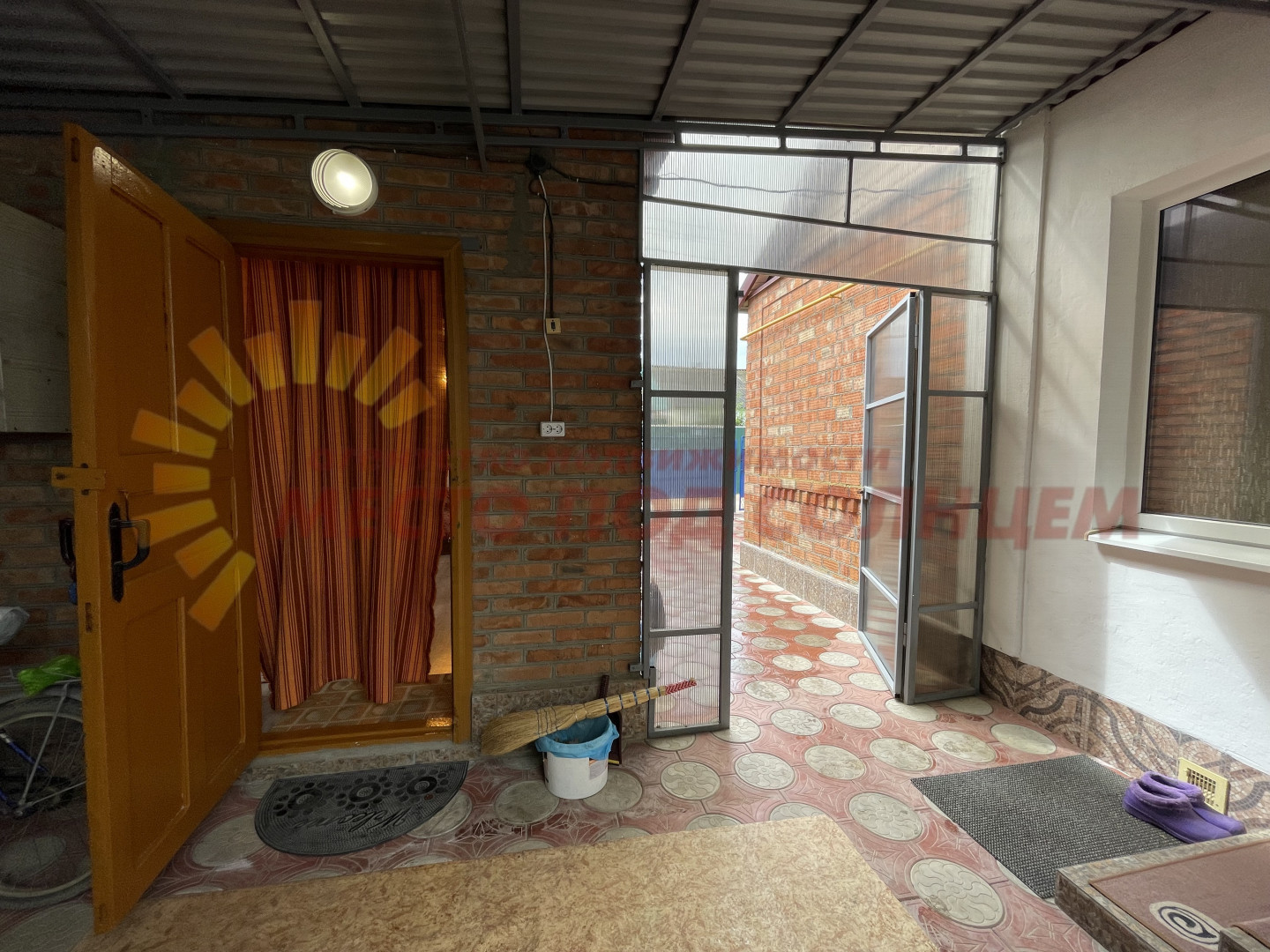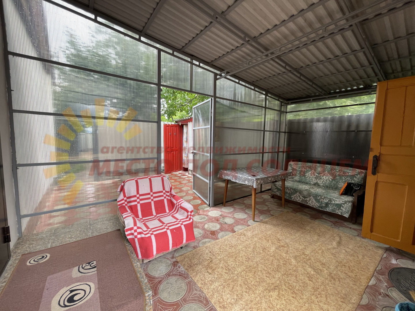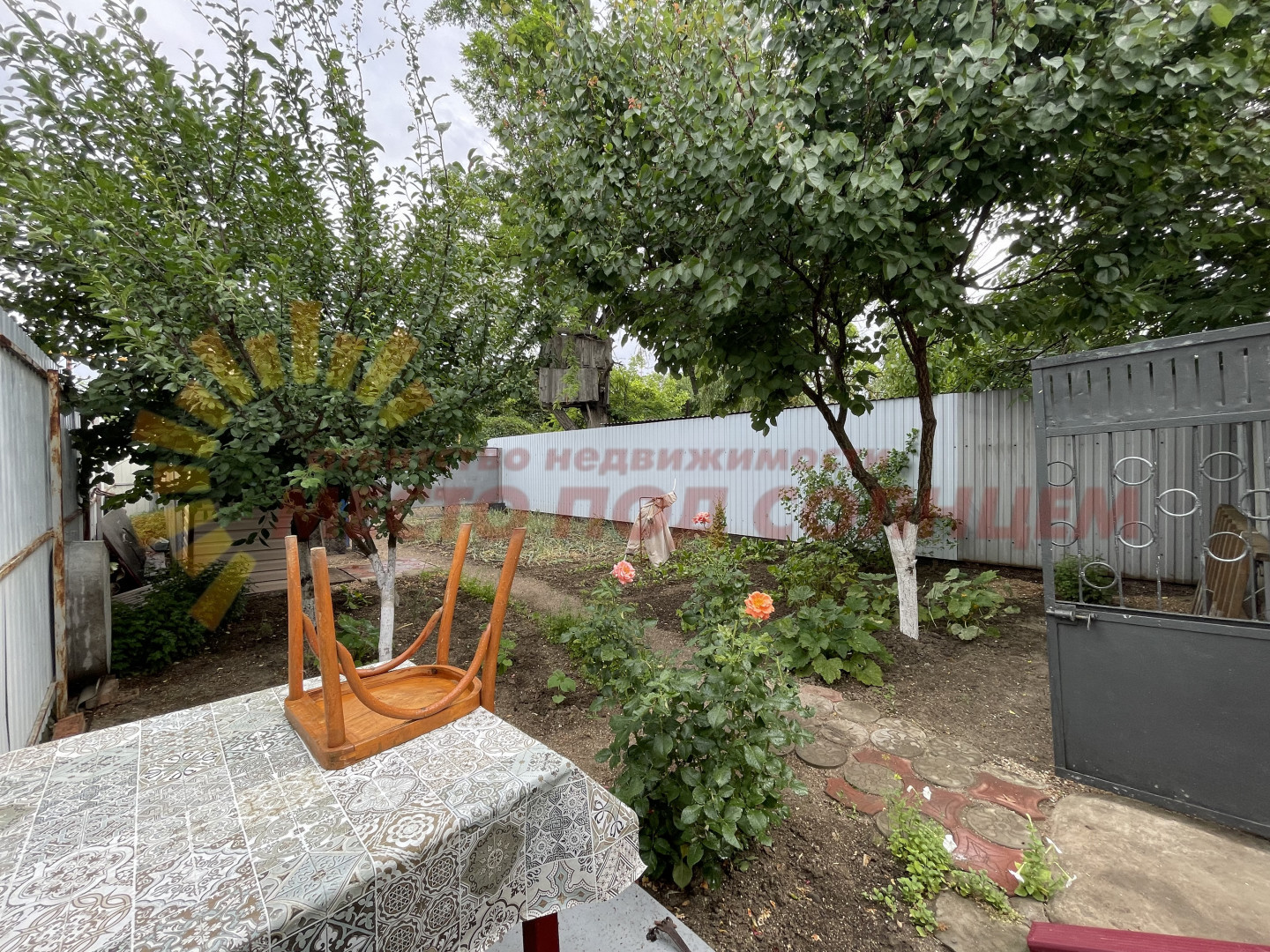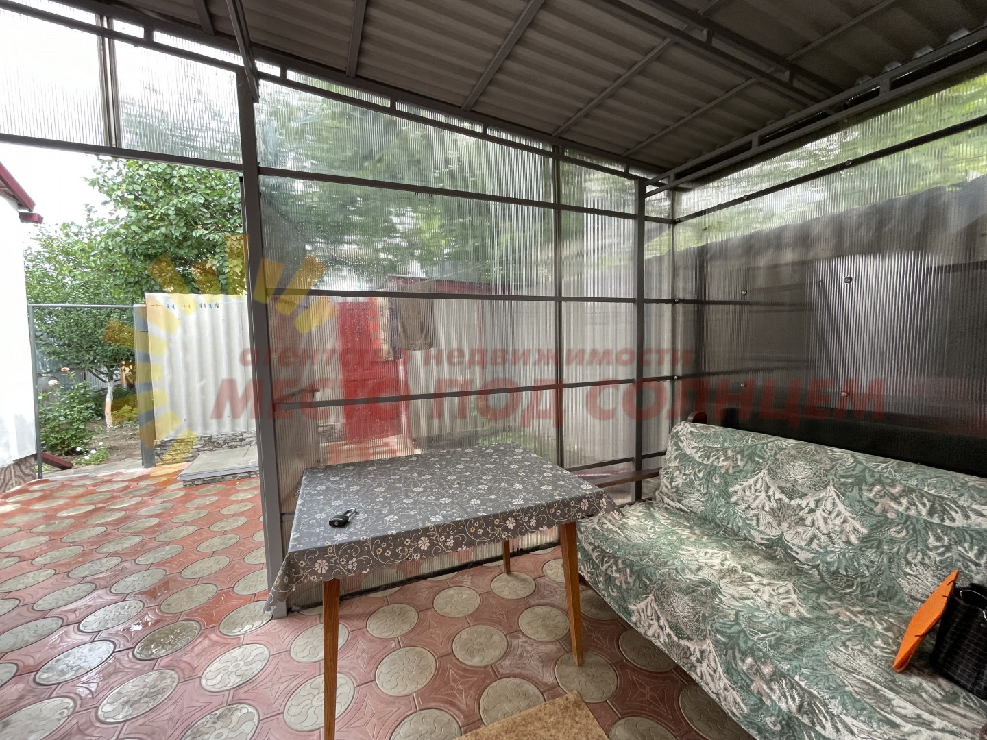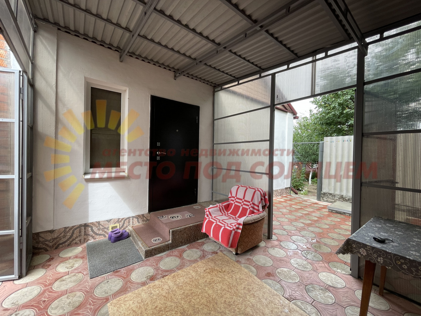 Участок имеет два въезда для машины с двух сторон. Двор выложен плиткой и ухожен. Вход в дом оборудован беседкой с навесом из поликарбоната, что обеспечивает тень и комфортное место для отдыха. На территории также имеется летняя кухня с водой и электричеством, которую можно использовать для дополнительного заработка.