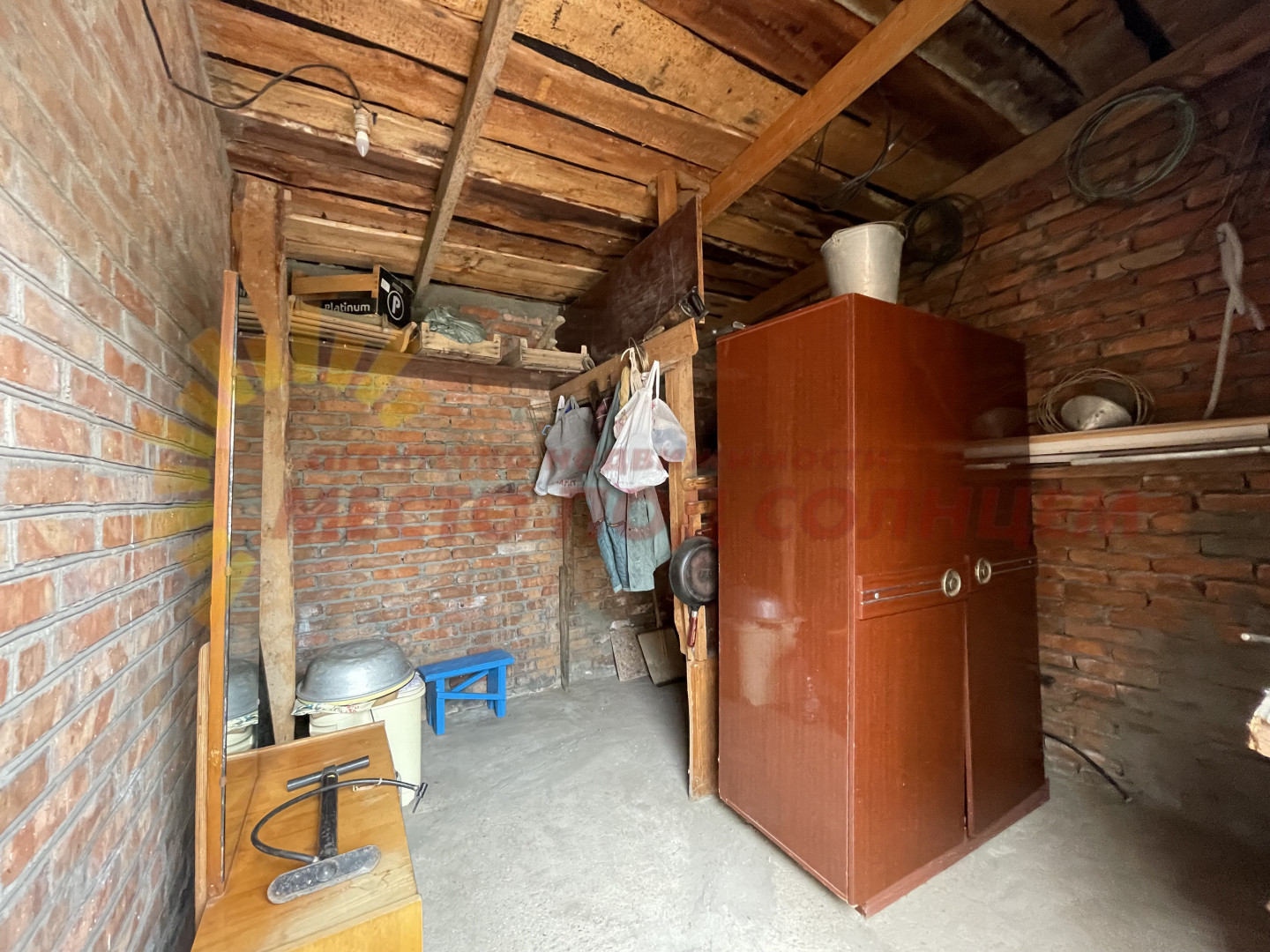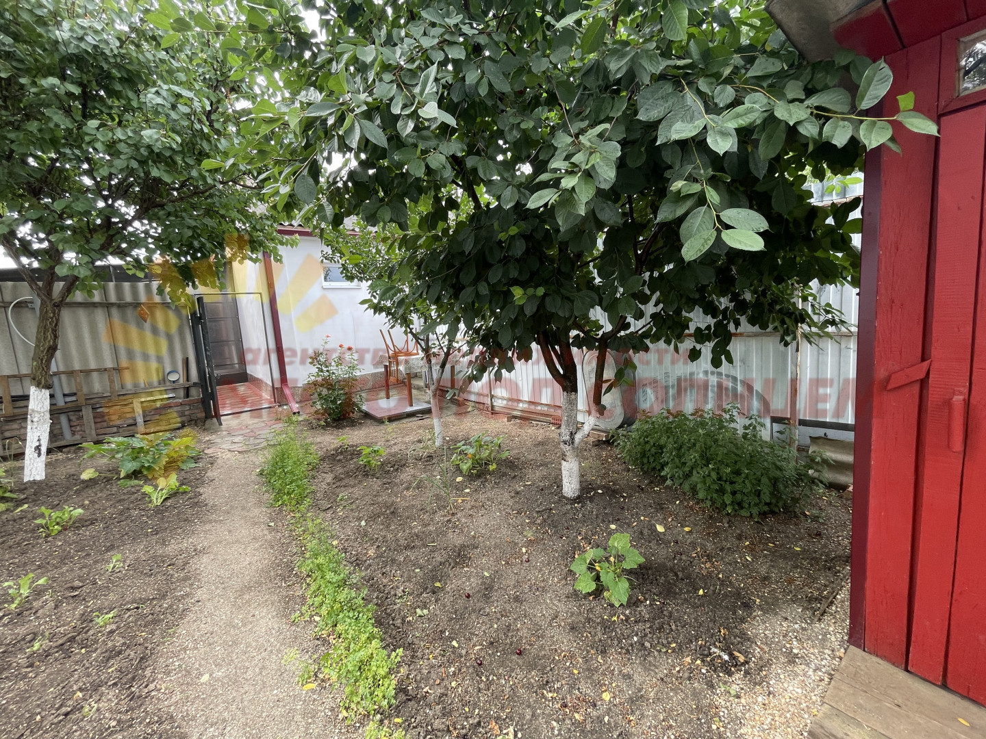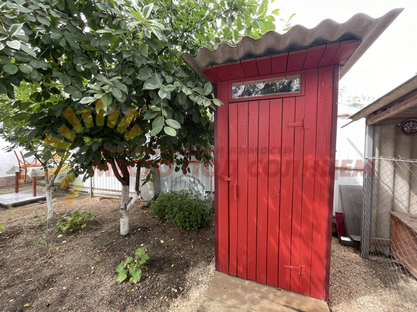 Кирпичную постройку на участке можно использовать как мастерскую или дополнительную комнату для отдыхающих. На заднем дворе располагается летний душ, огород с плодовыми деревьями (черешня, персик и др.), летний туалет, хозяйственная постройка и вольер для собаки.