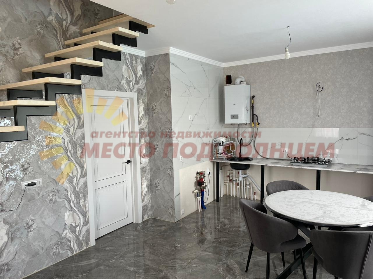 В доме современный 2х-контурный котел, от которого идет разводка на теплый пол (кухня, холл, санузел) + выведены задиаторы.